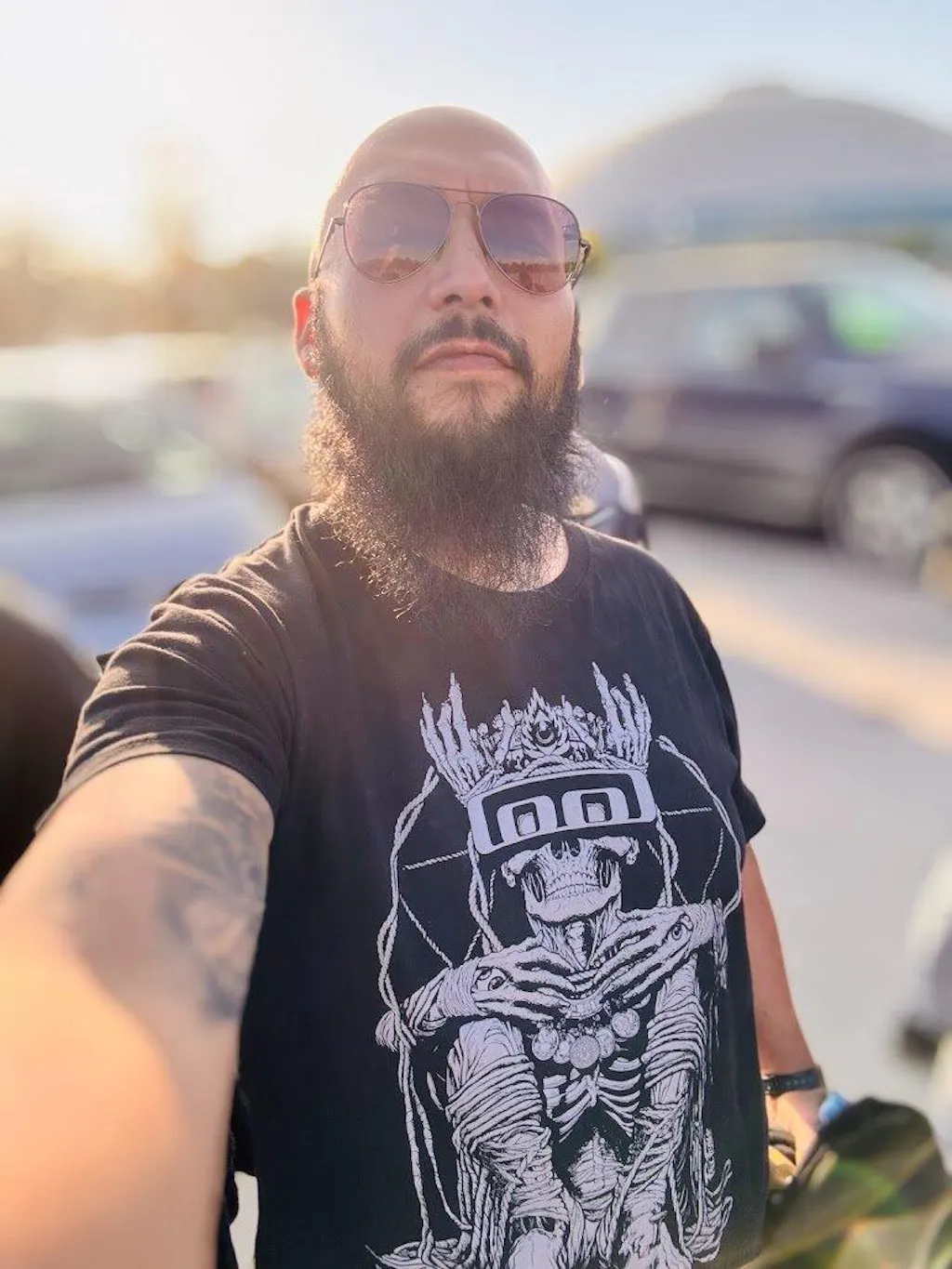 Seated in the pose of eternal waiting with Oculus Rift-style glasses with the band's logo on them, opening new spiritual states and the whole connection with the trance of psychedelia (Alex Grey) unlocking the third eye and the fourth and the fifth with double pupils just in case. And the metaphor of the mummy waiting 8,000 years for the band "We are spirit bound to this flesh" With 7 toes on one foot and "One foot nailed down" Pneuma. Its mummification cords in an aura of sacred geometry. Many interpretations and the ritual continues. And if I'm going to see them live, it has to be wearing this t-shirt. Each piece is unique as there is no original piece. 100% Cotton T-shirt. Screen printed in 1 color.