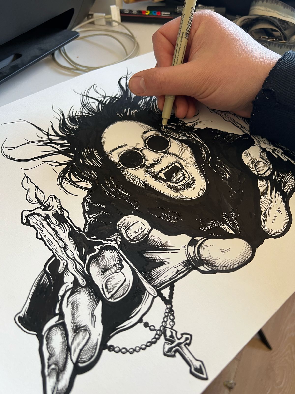 Listo! Me demoré en sacar este diseño supongo que por los procesos del duelo y esas cosas. Así que “No more tears” y vamos con la animita rockera pa San Ozzy. Les dejo algo del proceso de entintado de la piezas. Me gustó el concepto de “animita rockera” por varios motivos, pero eso del altar informal y homenaje portátil me funciona.
