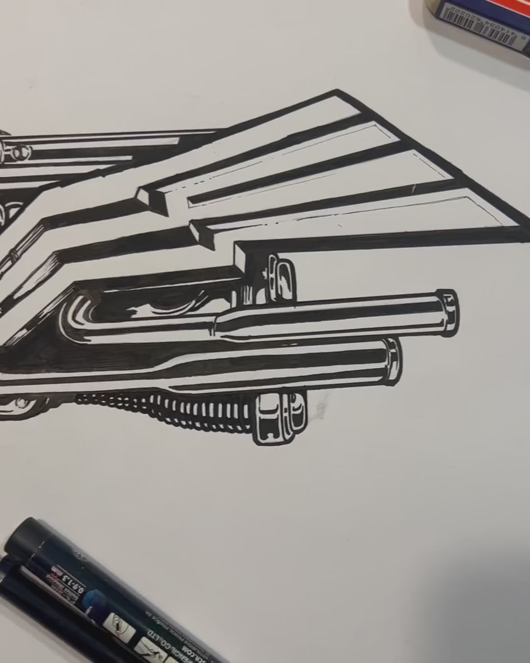 Hace rato que ando pegado con los gallos así que fue bien orgánico pa mi mutar la moto del Painkiller con el ave metálica en picada con armamento turbo asesino del Screaming for Vengance. Y el concepto “Turbo Cock” si bien tiene varias lecturas bajo el prontuario Judas, me funciona perfect para lo que quería hacer. Cuando estaba dibujando me volví a sentir en las clases de dibujo técnico en la U. Vuelta a la regla y tiralíneas concentración infinita pa no cagarla y no se imaginan la felicidad que es trabajar en papel.