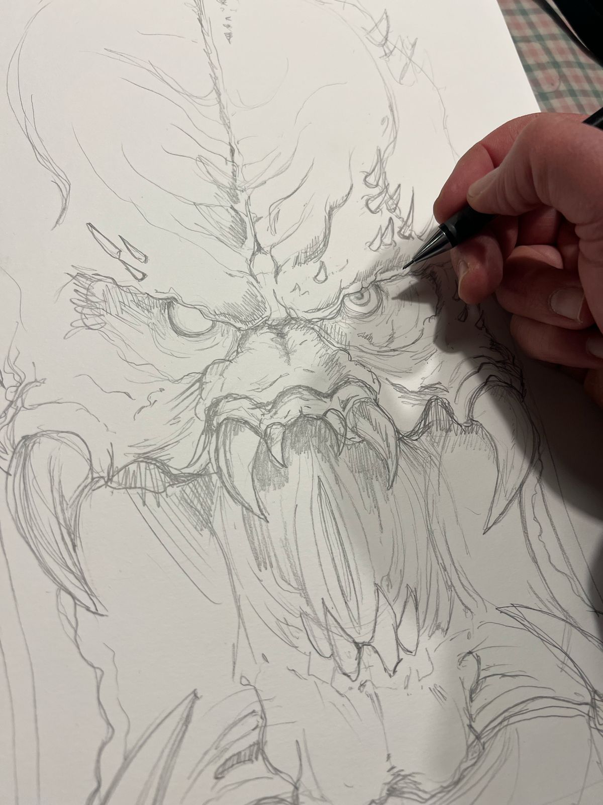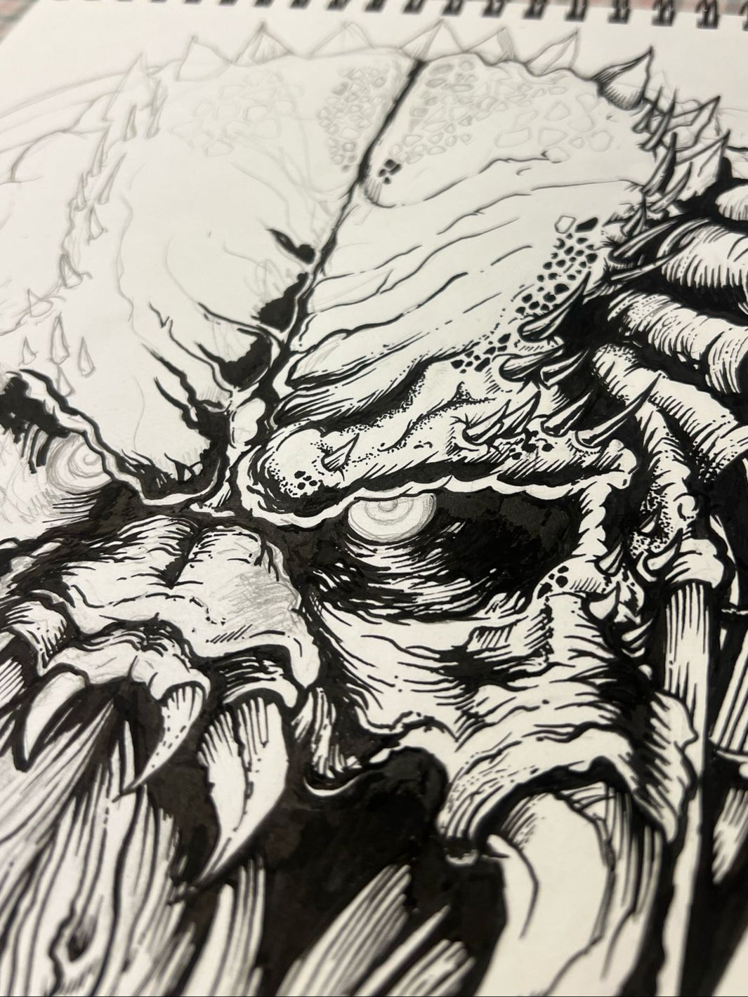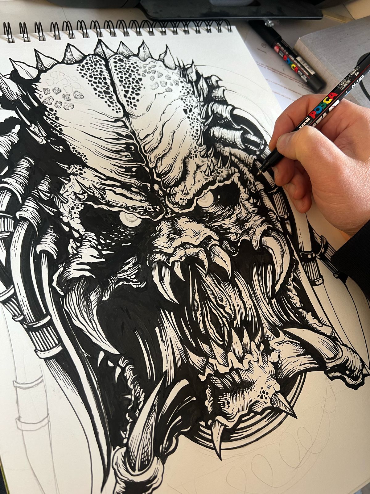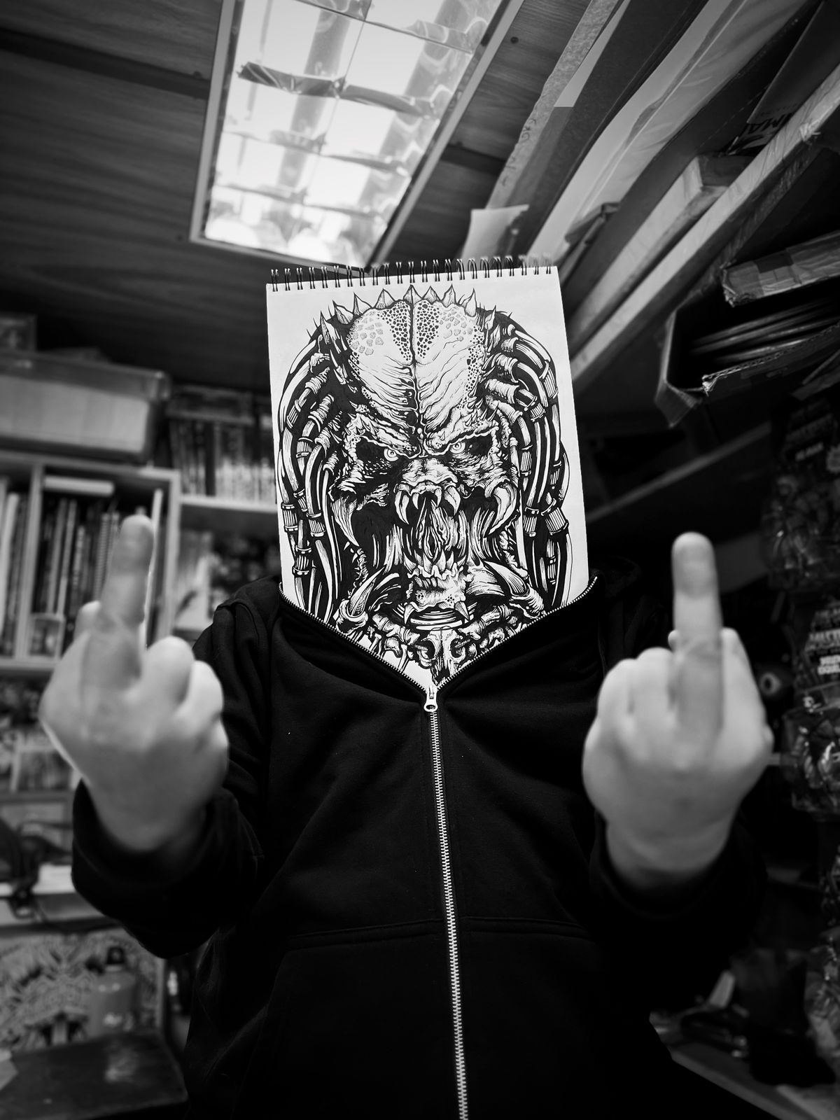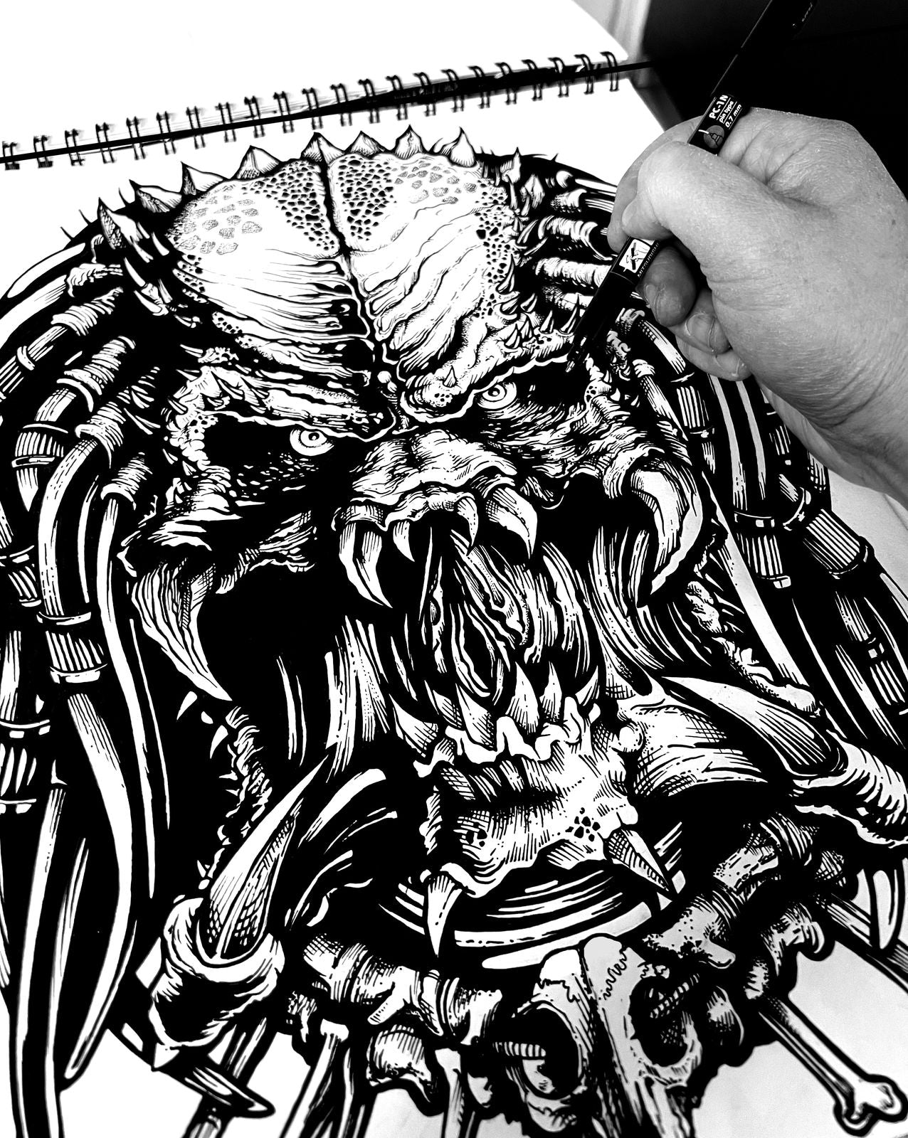 Mi escena favorita de “Predator”(1987) es cuando se saca la Mascara y Dutch (Arnold Schwarzenegger) le dice “You’Re One Ugly Motherfucker!” Me acuerdo haber pensado ohhh el wn feo, tengo que dibujarlo algún día. He disfrutado cada línea de este dibujo no lo quería terminar. Pero ya está! No entra niuna línea más. Vamos por el color.